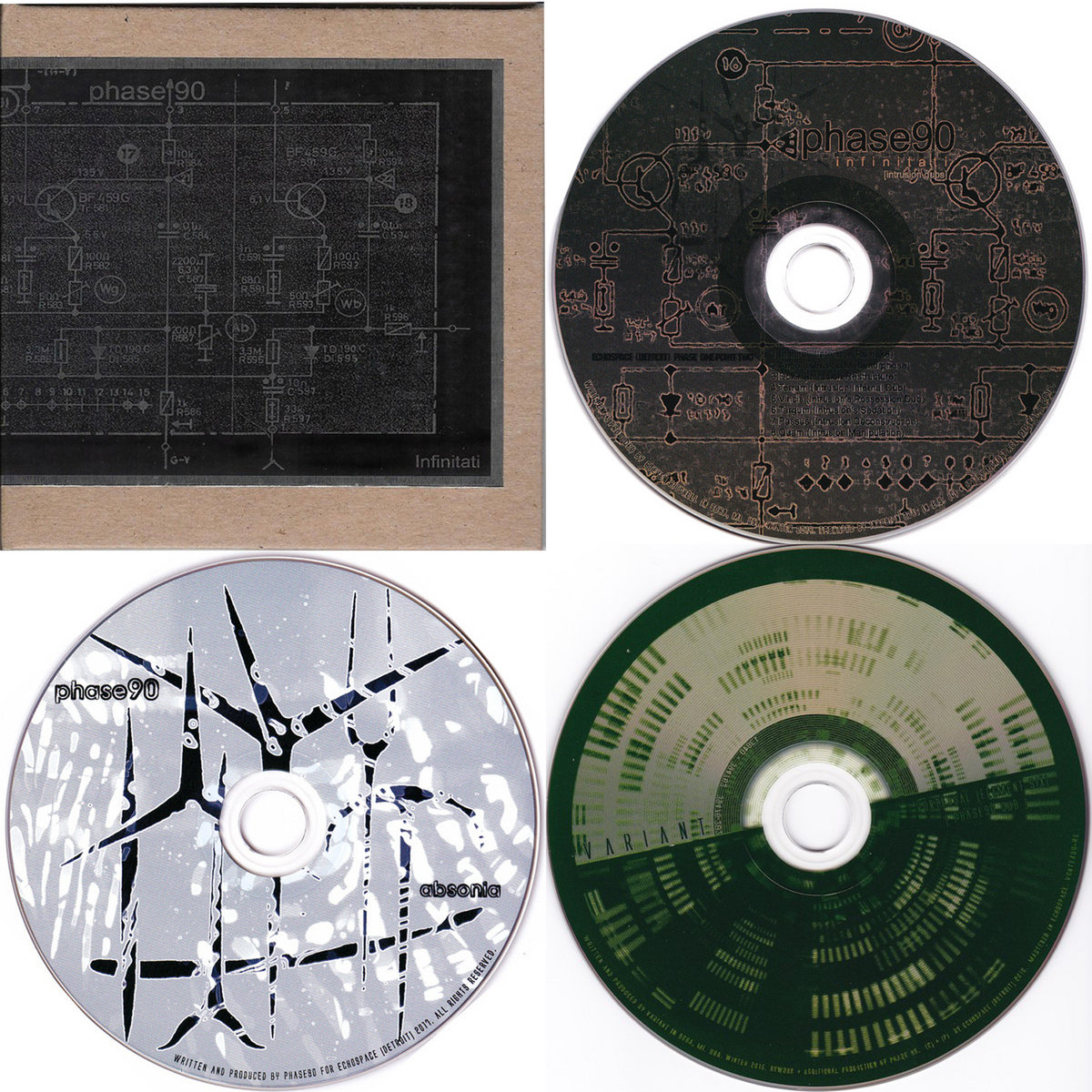 The entire Phase90 discography | including the original 2XLP (alchemy masters) hand numbered and screen printed by the incredible House Of Traps collective in the UK. Intrusion Dubs 12" single and the entire CD discography (absonia, infinitati, intrusion dubs + phase90's enchantment of variant's magnum opus) original brand new glass master CD's. Packaged in additional cardboard inserts and bubble wrap to ensure a safe voyage in the Holiday chaos of the United States Postal System. ;)